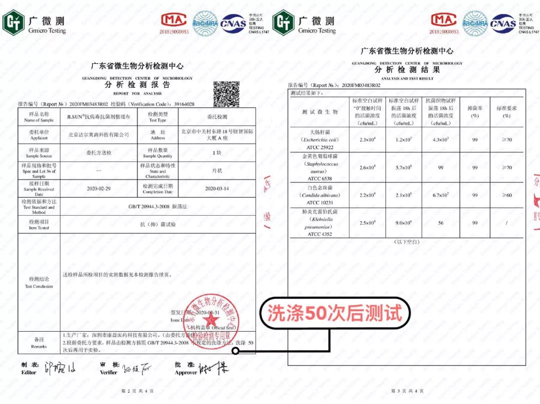 2020年2月,潔爾爽公司成功推出了抗菌抗病毒整理劑。為滿足人們對抗病毒紡織品的需求,作為全國抗菌紡織品研發中心以及抗菌國家標準的制定企業,潔爾爽公司的研發團隊以及潔爾爽微生物實驗中心的工程師們與相關科研機構開展合作,包括對抗病毒整理劑的處理工藝的優化、抗病毒效果的評估、以及耐洗性問題等。經第三方權威機構廣東微生物分析檢驗中心測試,整理后的織物,經過廣東微生物分析檢測中心標準洗滌50次后,仍對金黃色葡萄球菌、大腸桿菌、白色念珠菌、肺炎克雷伯氏菌的抑菌率均大于99%,抗擊甲型流感病毒H1N1的活性值大于5.05,抗病毒活性率大于99.9%。